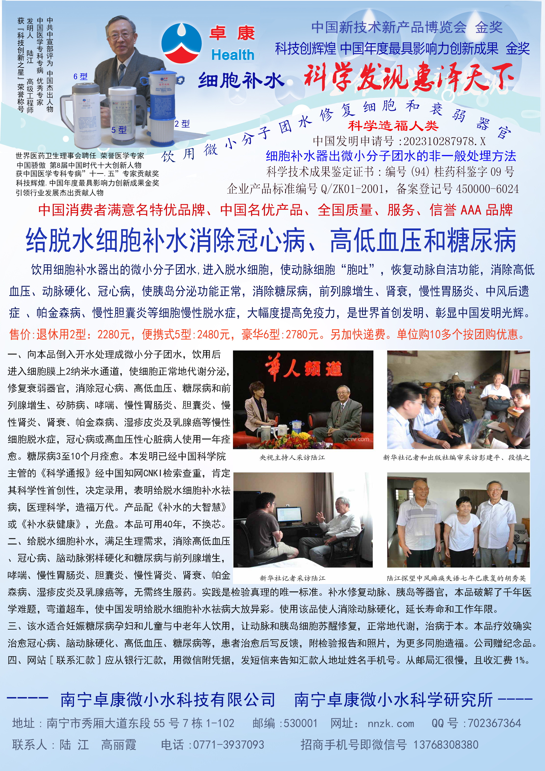 人類幾千年來患以上病癥需終生服藥,幾十年也不能治愈。可是我國(guó)南寧的高級(jí)工程師陸 江,于1990年想根治高血壓,研究發(fā)明了離子水瓶,處理出微小分子團(tuán)水供飲用,經(jīng)過醫(yī)院臨床試用和專家鑒定,1999年獲中國(guó)發(fā)明專利權(quán),產(chǎn)品于2000年投放市場(chǎng)后一直跟蹤調(diào)查,據(jù)全國(guó)各地用戶反饋:祛除了高低血壓、糖尿病和冠心病,并使前列腺增生、咽喉炎、鼻竇炎、慢性氣管炎、支氣管炎、矽肺病、哮喘、慢性胃炎、腸炎、慢性膽囊炎、慢性腎炎、腎衰、膀胱炎、便秘、痔瘡、風(fēng)濕性關(guān)節(jié)炎和濕疹皮炎及中風(fēng)后遺癥等病癥不藥而愈。為什么喝微小水能治20多種病?陸 江從1991年德國(guó)科學(xué)家發(fā)現(xiàn)細(xì)胞膜水通道僅為2納米獲得啟發(fā),認(rèn)為多種器官患病是因細(xì)胞脫水,不能正常代謝和分裂增殖,才使器官細(xì)胞減少致衰弱萎縮而形成細(xì)胞缺水性病癥。22年來的實(shí)踐有力地支持了“細(xì)胞脫水致病”這一重要論點(diǎn),表明喝微小水可滿足細(xì)胞的生理需求,補(bǔ)水就能祛病,是生命科學(xué)新亮點(diǎn)。